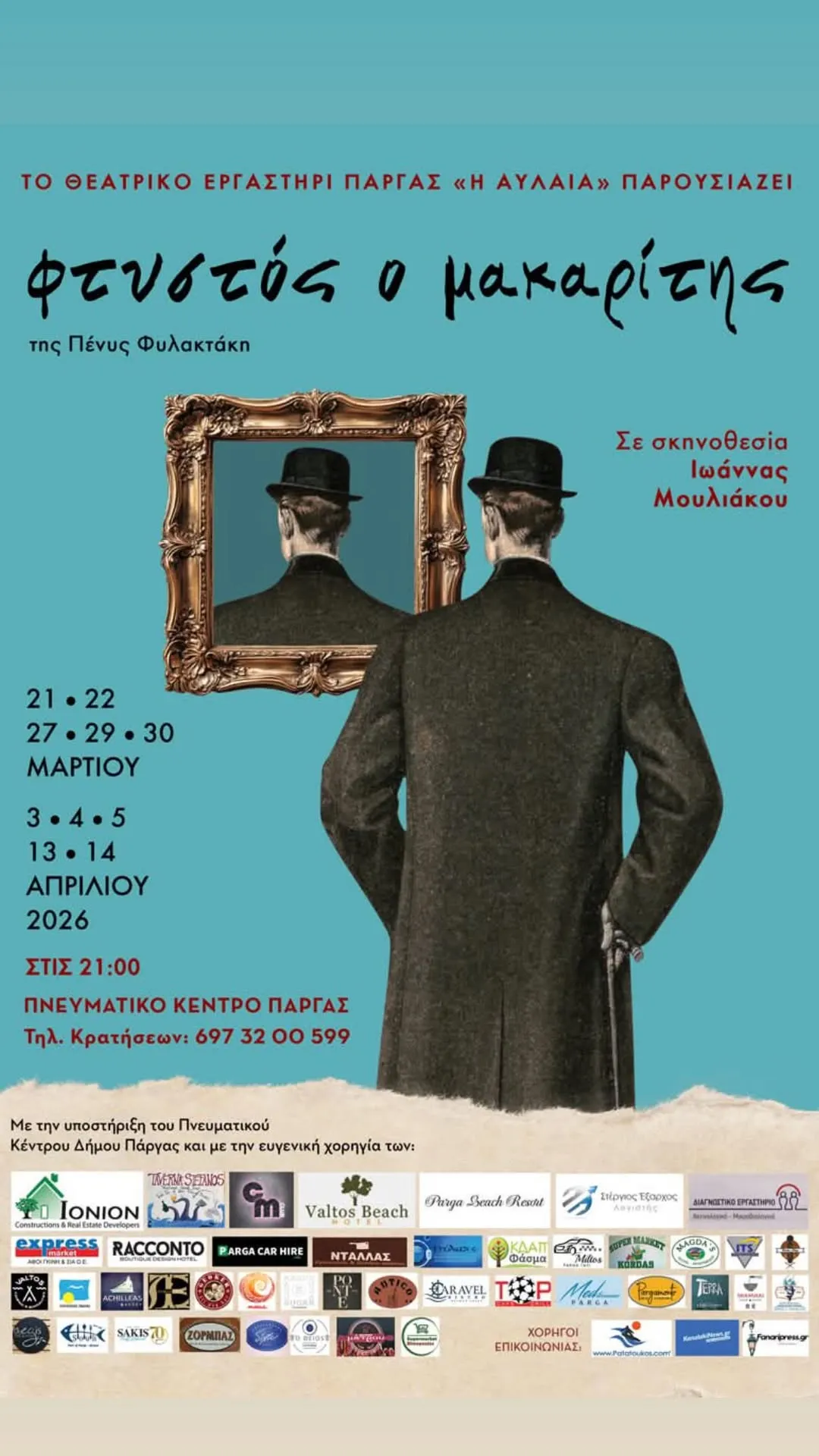 Οι παραστάσεις έχουν προγραμματιστεί για 21–22 και 27–29 Μαρτίου, καθώς και 3–5 και 13–14 Απριλίου 2026, στις 21:00, στο Πνευματικό Κέντρο Πάργας.