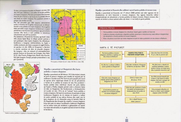 Στη σελίδα 8 ιστορικές αναφορές, συμπεριλαμβανομένης της απόδοσης της «αλβανικής περιοχής της Τσαμουριάς» στην Ελλάδα το 1913. Δεσπόζει κάτω αριστερά ο πολιτικός χάρτης των αλβανικών περιοχών.