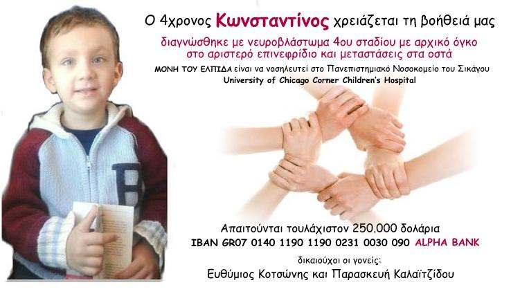 Έκκληση για βοήθεια στον 4χρονο Κωνσταντίνο απο την Παραμυθιά, που πάσχει από νευροβλάστωμα 4ου σταδίου με αρχικό όγκο στο αριστερό επινεφρίδιο και μεταστάσεις στα οστά και στον μυελό απευθύνουν οι γονείς του Ευθύμιος Κοτσώνης και Παρασκευή Καλαϊτζίδου. Ο μικρός Κωνσταντίνος δίνει τη μάχη διατηρώντας το παιδικό του κέφι.Οι γιατροί του στο Ιπποκράτειο καταβάλλουν κάθε δυνατή προσπάθεια για τη θεραπεία του, ωστόσο αυτή τη στιγμή ούτε στη Γερμανία ούτε στο νοσοκομείο Memorial της Νέας Υόρκης μπορεί να παρασχεθεί κάτι περισσότερο. Μόνη του ελπίδα είναι να νοσηλευτεί στο…