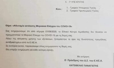 Σε δήλωσή τους για την εντολή της Διοίκησης του Εθνικού Κέντρου Αιμοδοσίας προς τις Υγειονομικές Περιφέρειες να μη στέλνουν προς το ΕΚΕΑ δείγματα για τεστ κορονοϊού, γιατί ξεπεράστηκε...